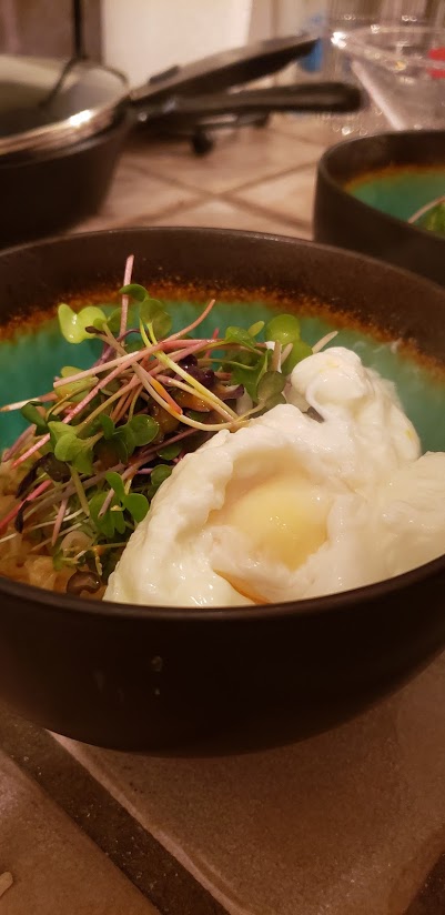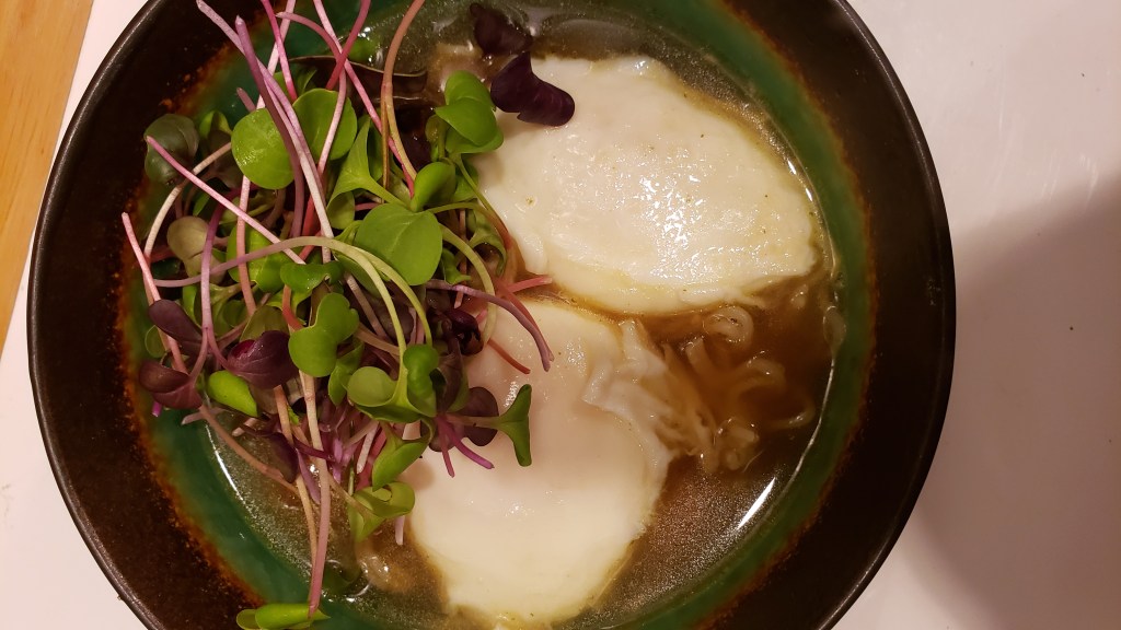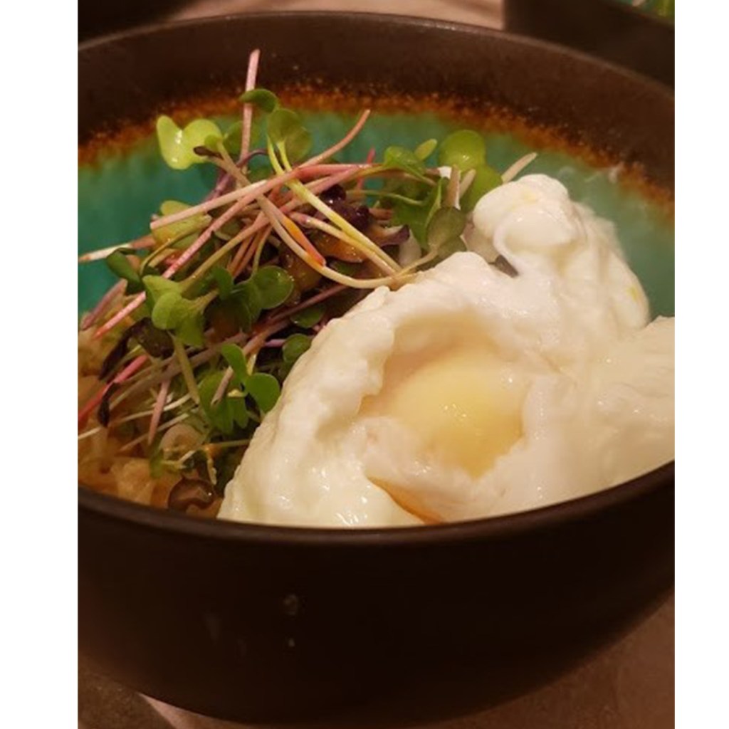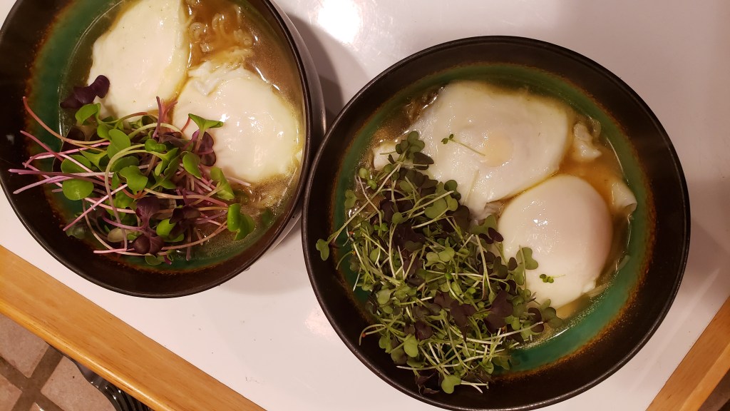 This traditional soup is spiced up with poached eggs, and a mix of spicy microgreens.
