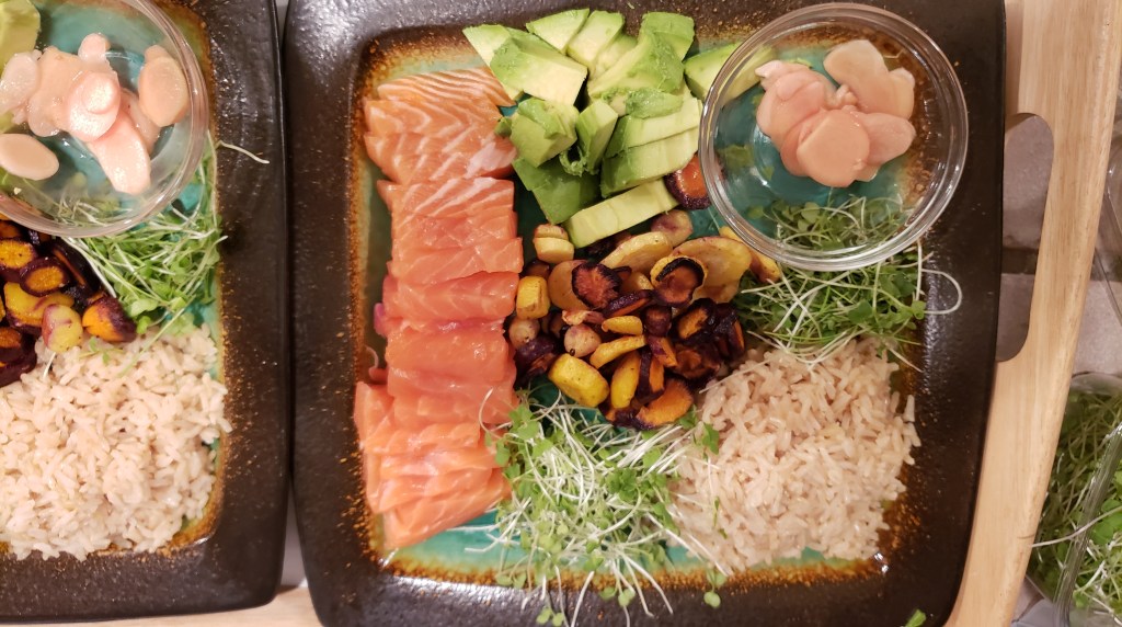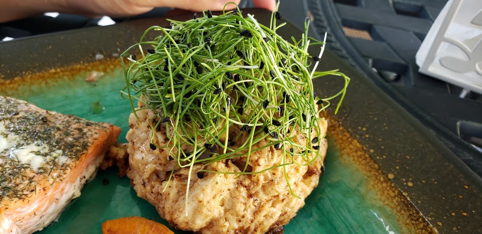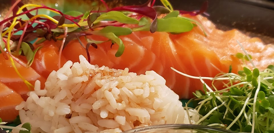 Fresh, sushi-grade salmon or tuna steak topped with Japanese rice, and wasabi mustard microgreens. Another great addition is to add our mild mix microgreen blend.