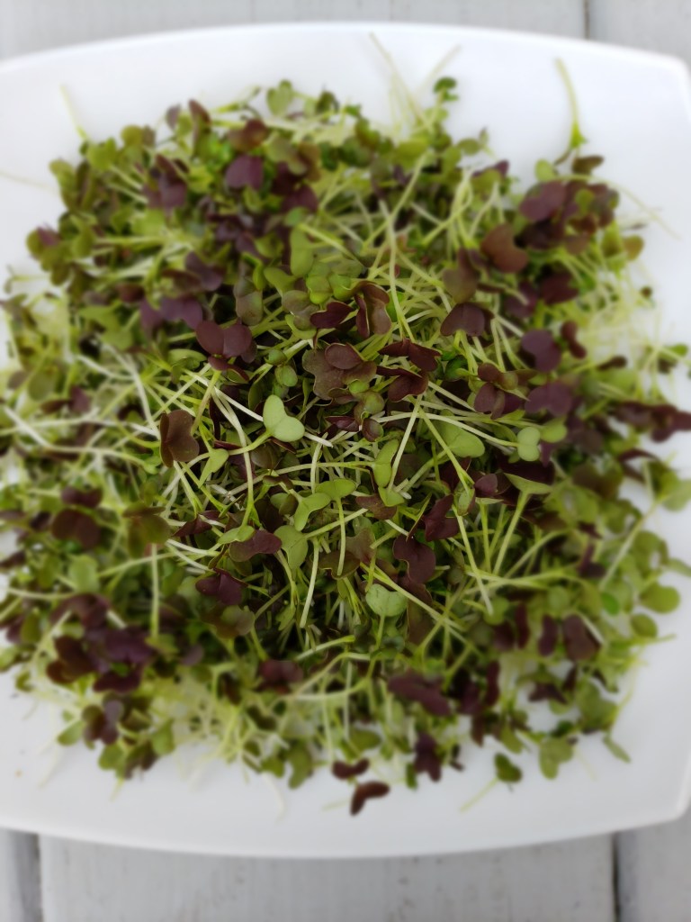 This is a beautiful green and purple mix that has an amazing mix of colors and nutrients. The Mild Micro mix is a delicious addition to any meal and it is packed with all the nutrients from mizuna, cabbage, kale, and kohlrabi. This mix will make any plate look and taste gourmet.